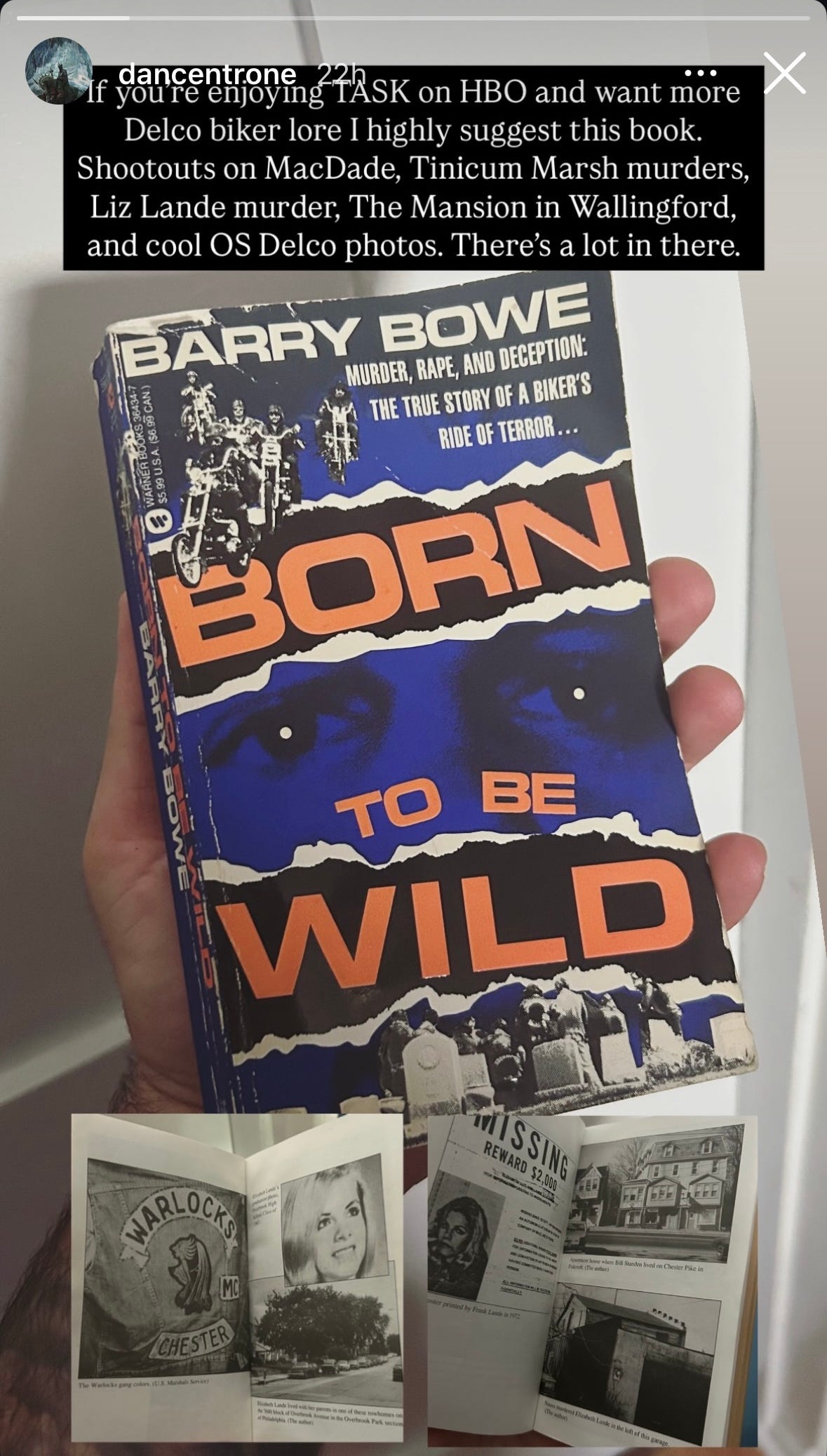Dan Centrone, a music video director I grew up with in Delco, posted on Instagram stories of sharing the novel, Born To Be Wild if you’re enjoying Task.